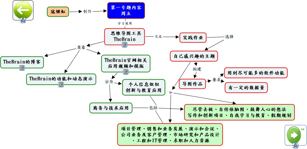此概念图以 IHMC CmapTools 创建, 内含信息有关于: 第一专题2 思维导图, 导图作品 要求 有一定的数据量, TheBrain官网相关 应用视频和模版 分为 商务与技术应用, 个人信息组织 创新与教育应用 包括 项目管理、销售和业务发展、演示和会议、 公司业务及客户管理、市场研究和产品设计 、工程和IT管理、求职和人力资源, 自己感兴趣的主题 如 项目管理、销售和业务发展、演示和会议、 公司业务及客户管理、市场研究和产品设计 、工程和IT管理、求职和人力资源, 商务与技术应用 包括 项目管理、销售和业务发展、演示和会议、 公司业务及客户管理、市场研究和产品设计 、工程和IT管理、求职和人力资源, 思维导图工具 TheBrain 查看 TheBrain的博客, 自己感兴趣的主题 构建 导图作品, 导图作品 要求 用到尽可能多的软件功能, 自己感兴趣的主题 如 尽管去做、自传体脑图、鼓舞人心的想法 写作和创新项目、自我学习与教育、假期规划, 思维导图工具 TheBrain 查看 TheBrain官网相关 应用视频和模版, 第一专题内容 周五 学习使用 思维导图工具 TheBrain, 实践作业 选择 自己感兴趣的主题, 个人信息组织 创新与教育应用 包括 尽管去做、自传体脑图、鼓舞人心的想法 写作和创新项目、自我学习与教育、假期规划, 商务与技术应用 包括 尽管去做、自传体脑图、鼓舞人心的想法 写作和创新项目、自我学习与教育、假期规划, 寇继虹 制作 第一专题内容 周五, 思维导图工具 TheBrain 完成 实践作业, TheBrain官网相关 应用视频和模版 分为 个人信息组织 创新与教育应用, 思维导图工具 TheBrain 查看 TheBrain的功能和动态演示