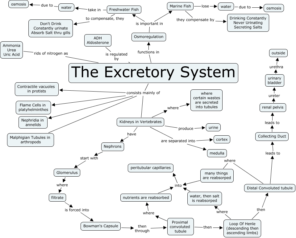 This Concept Map, created with IHMC CmapTools, has information related to: excretory system, The Excretory System consists mainly of Flame Cells in platyhelminthes, The Excretory System consists mainly of Contractile vacuoles in protists, renal pelvis ureter urinary bladder, Kidneys in Vertebrates are separated into medulla, Proximal convoluted tubule where nutrients are reabsorbed, Kidneys in Vertebrates have Nephrons, The Excretory System consists mainly of Malphigian Tubules in arthropods, Bowman's Capsule then through Proximal convoluted tubule, Nephrons start with Glomerulus, Osmoregulation is important in Freshwater Fish, Distal Convoluted tubule leads to Collecting Duct, Loop Of Henle (descending then ascending limbs) where water, then salt is reabsorped, Proximal convoluted tubule then Loop Of Henle (descending then ascending limbs), The Excretory System consists mainly of Kidneys in Vertebrates, water, then salt is reabsorped into peritubular capillaries, The Excretory System rids of nitrogen as Ammonia Urea Uric Acid, Glomerulus where filtrate, Kidneys in Vertebrates where where certain wastes are secreted into tubules, Collecting Duct leads to renal pelvis, The Excretory System functions in Osmoregulation
