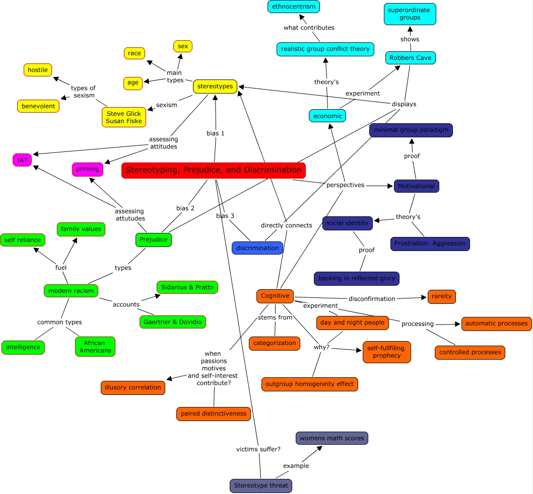 This Concept Map, created with IHMC CmapTools, has information related to: Stereotyping, Prejudice, and Discrimination, Motivational theory's social identity, stereotypes main types race, realistic group conflict theory what contributes ethnocentrism, Cognitive when passions motives and self-interest contribute? paired distinctiveness, Robbers Cave displays stereotypes, modern racism accounts Sidanius & Pratto, Cognitive when passions motives and self-interest contribute? illusory correlation, stereotypes main types sex, Stereotyping, Prejudice, and Discrimination perspectives Cognitive, economic experiment Robbers Cave, modern racism fuel self reliance, Cognitive disconfirmation rareity, stereotypes assessing attitudes IAT, modern racism accounts Gaertner & Dovidio, Robbers Cave displays Prejudice, Stereotyping, Prejudice, and Discrimination victims suffer? Stereotype threat, Cognitive experiment day and night people, Cognitive why? outgroup homogeneity effect, day and night people why? self-fullfiling prophecy, stereotypes sexism Steve Glick Susan Fiske
