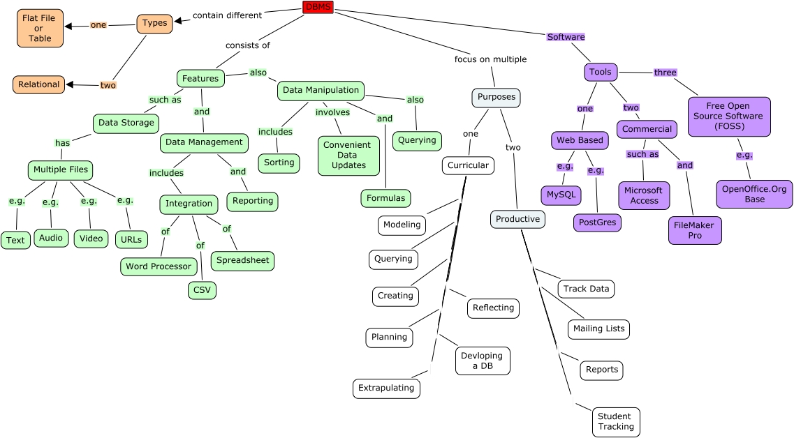 This Concept Map, created with IHMC CmapTools, has information related to: Database management Systems in Education, Types one Flat File or Table, Curricular Extrapulating, Data Management and Reporting, Multiple Files e.g. Video, Productive Mailing Lists, Commercial such as Microsoft Access, Multiple Files e.g. URLs, DBMS consists of Features, Tools three Free Open Source Software (FOSS), DBMS focus on multiple Purposes, Data Management includes Integration, Web Based e.g. MySQL, Features and Data Management, Tools two Commercial, Commercial and FileMaker Pro, Features also Data Manipulation, Productive Student Tracking, Productive Reports, Curricular Planning, Data Manipulation involves Convenient Data Updates