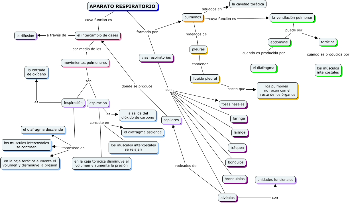 Este mapa conceptual tiene información relacionada a: Cmap respiratorio Ana Stuyk, vias respiratorias son fosas nasales, capilares donde se produce el intercambio de gases, APARATO RESPIRATORIO formado por vias respiratorias, inspiración consiste en el diafragma desciende, espiración consiste en en la caja torácica disminuye el volumen y aumenta la presión, la ventilación pulmonar puede ser torácica, líquido pleural hacen que los pulmones no rocen con el resto de los órganos, inspiración consiste en los musculos intercostales se contraen, espiración consiste en los musculos intercostales se relajan, movimientos pulmonares son inspiración, pleuras contienen líquido pleural, alvéolos son unidades funcionales, inspiración consiste en en la caja torácica aumenta el volumen y disminuye la presion, abdominal cuando es producida por el diafragma, pulmones situados en la cavidad torácica, APARATO RESPIRATORIO cuya función es el intercambio de gases, vias respiratorias son faringe, pulmones rodeados de pleuras, el intercambio de gases por medio de los movimientos pulmonares, el intercambio de gases a través de la difusión