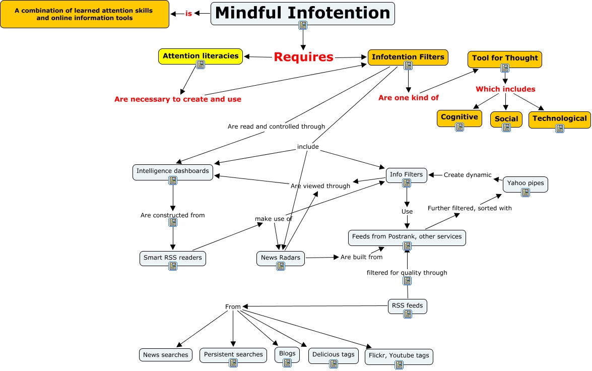 This Concept Map, created with IHMC CmapTools, has information related to: Infotention Filters, RSS feeds filtered for quality through Feeds from Postrank, other services, Infotention Filters include News Radars, Mindful Infotention Requires Infotention Filters, Infotention Filters include Info Filters, RSS feeds From Delicious tags, Infotention Filters include Intelligence dashboards, News Radars Are viewed through Intelligence dashboards, Info Filters Use Feeds from Postrank, other services, Smart RSS readers make use of Info Filters, Tool for Thought Which includes Social, Mindful Infotention Requires Attention literacies, Intelligence dashboards Are constructed from Smart RSS readers, Attention literacies Are necessary to create and use Infotention Filters, Infotention Filters Are read and controlled through Intelligence dashboards, Info Filters Are viewed through Intelligence dashboards, Feeds from Postrank, other services Further filtered, sorted with Yahoo pipes, Mindful Infotention is A combination of learned attention skills and online information tools, Yahoo pipes Create dynamic Info Filters, RSS feeds From Flickr, Youtube tags, RSS feeds From Persistent searches