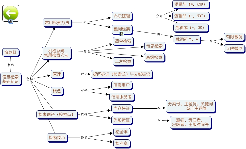 此概念图以 IHMC CmapTools 创建, 内含信息有关于: 信息检索基础知识, 机检系统 常用检索方法 分 高级检索, 信息检索 基础知识 包括 原理, 信息检索 基础知识 包括 常用检索方法, 检索途径(检索点) 依据 外部特征, 布尔逻辑 分为 逻辑与(*,AND), 信息检索 基础知识 包括 检索技巧, 检索技巧 提高 检准率, 布尔逻辑 分为 逻辑非(-,NOT), 截词符?,* 分 有限截词, 布尔逻辑 分为 逻辑或(+,OR), 常用检索方法 有 截词检索, 外部特征 如 题名、责任者、 出版者、出版时间等, 机检系统 常用检索方法 分 二次检索, 概念 对于 信息用户, 信息检索 基础知识 包括 概念, 机检系统 常用检索方法 分 简单检索, 检索途径(检索点) 依据 内容特征, 寇继虹 制作 信息检索 基础知识, 常用检索方法 有 布尔逻辑, 截词符?,* 分 无限截词