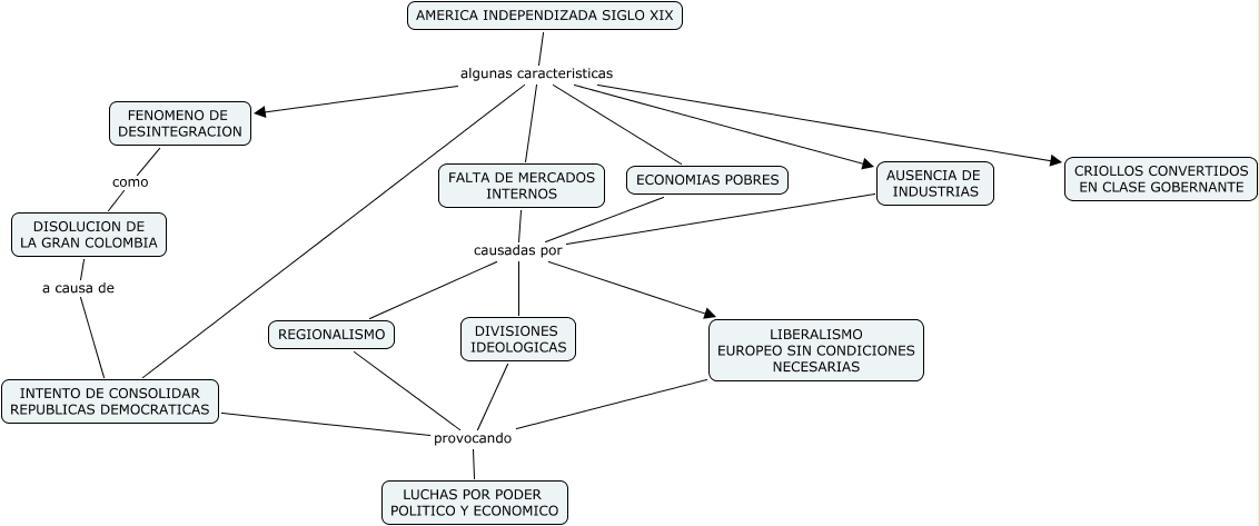 Este Cmap, tiene información relacionada con: America independizada siglo XIX, DISOLUCION DE LA GRAN COLOMBIA a causa de INTENTO DE CONSOLIDAR REPUBLICAS DEMOCRATICAS, AMERICA INDEPENDIZADA SIGLO XIX algunas caracteristicas AUSENCIA DE INDUSTRIAS, FALTA DE MERCADOS INTERNOS causadas por LIBERALISMO EUROPEO SIN CONDICIONES NECESARIAS, DIVISIONES IDEOLOGICAS provocando LUCHAS POR PODER POLITICO Y ECONOMICO, AMERICA INDEPENDIZADA SIGLO XIX algunas caracteristicas ECONOMIAS POBRES, AMERICA INDEPENDIZADA SIGLO XIX algunas caracteristicas FENOMENO DE DESINTEGRACION, FENOMENO DE DESINTEGRACION como DISOLUCION DE LA GRAN COLOMBIA, LIBERALISMO EUROPEO SIN CONDICIONES NECESARIAS provocando LUCHAS POR PODER POLITICO Y ECONOMICO, AMERICA INDEPENDIZADA SIGLO XIX algunas caracteristicas INTENTO DE CONSOLIDAR REPUBLICAS DEMOCRATICAS, FALTA DE MERCADOS INTERNOS causadas por REGIONALISMO, ECONOMIAS POBRES causadas por LIBERALISMO EUROPEO SIN CONDICIONES NECESARIAS, FALTA DE MERCADOS INTERNOS causadas por DIVISIONES IDEOLOGICAS, AUSENCIA DE INDUSTRIAS causadas por REGIONALISMO, ECONOMIAS POBRES causadas por DIVISIONES IDEOLOGICAS, REGIONALISMO provocando LUCHAS POR PODER POLITICO Y ECONOMICO, ECONOMIAS POBRES causadas por REGIONALISMO, AUSENCIA DE INDUSTRIAS causadas por DIVISIONES IDEOLOGICAS, INTENTO DE CONSOLIDAR REPUBLICAS DEMOCRATICAS provocando LUCHAS POR PODER POLITICO Y ECONOMICO, AUSENCIA DE INDUSTRIAS causadas por LIBERALISMO EUROPEO SIN CONDICIONES NECESARIAS, AMERICA INDEPENDIZADA SIGLO XIX algunas caracteristicas CRIOLLOS CONVERTIDOS EN CLASE GOBERNANTE