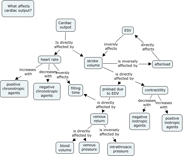 This Concept Map, created with IHMC CmapTools, has information related to: Stephanie Lilla Cardiac output map, Cardiac output Is directly affected by stroke volume, venous return is inversely affected by intrathroacic pressure, stroke volume is directly affected by preload due to EDV, heart rate decreases with negative chronotropic agents, stroke volume is inversely affected by afterload, contractility increases with positive inotropic agents, stroke volume is directly affected by contractility, ESV inversly affects stroke volume, afterload directly affects ESV, contractility decreases with negative inotropic agents, heart rate increases with positive chronotropic agents, preload due to EDV is directly affected by venous return, venous return is directly affected by venous pressure, venous return is directly affected by blood volume, heart rate inversly affects filling time, Cardiac output Is directly affected by heart rate, preload due to EDV is directly affected by filling time