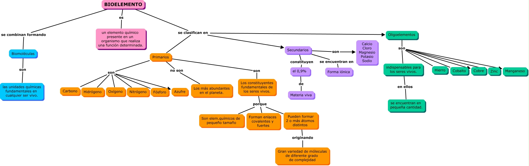 Este Cmap, tiene información relacionada con: bioelementos, BIOELEMENTO se clasifican en Secundarios, Oligoelementos son indispensables para los seres vivos., Primarios son Nitrógeno, BIOELEMENTO se combinan formando Biomoléculas, Oligoelementos son Cobalto, Oligoelementos son Cobre, BIOELEMENTO se clasifican en Oligoelementos, BIOELEMENTO es un elemento químico presente en un organismo que realiza una función determinada., Primarios son Hidrógeno, Primarios son Oxígeno, Secundarios son Calcio Cloro Magnesio Potasio Sodio, Primarios son Fósforo, Primarios son Carbono, el 0,9% de Materia viva, BIOELEMENTO se clasifican en Primarios, Secundarios constituyen el 0,9%, Los constituyentes fundamentales de los seres vivos. porque Pueden formar 2 o más átomos distintos, Primarios no son Los más abundantes en el planeta., Los constituyentes fundamentales de los seres vivos. porque Forman enlaces covalentes y fuertes, Oligoelementos son Zinc
