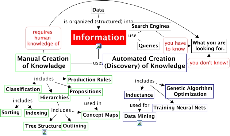 This Concept Map, created with IHMC CmapTools, has information related to: Finding Knowledge, Search Engines you have to know What you are looking for., Manual Creation of Knowledge includes Hierarchies, Automated Creation (Discovery) of Knowledge uses Information, Automated Creation (Discovery) of Knowledge includes Genetic Algorithm Optimization, Queries use Information, Inductance used for Data Mining, Manual Creation of Knowledge includes Propositions, Manual Creation of Knowledge includes Production Rules, Automated Creation (Discovery) of Knowledge includes Training Neural Nets, Propositions used in Concept Maps, Classification includes Sorting, Search Engines use Information, Hierarchies includes Outlining, Manual Creation of Knowledge includes Classification, Manual Creation of Knowledge uses Information, Manual Creation of Knowledge requires human knowledge of What you are looking for., Hierarchies includes Concept Maps, Automated Creation (Discovery) of Knowledge includes Inductance, Hierarchies includes Tree Structures, Automated Creation (Discovery) of Knowledge you don't know! What you are looking for.