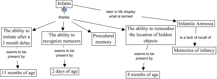 This Concept Map, created with IHMC CmapTools, has information related to: Cognitive Development - Infancy, Infants display The ability to remember the location of hidden objects, The ability to remember the location of hidden objects seems to be present by 8 months of age, Infants display The ability to recognize nurturers, Infants later in life display what is termed Infantile Amnesia, Infantile Amnesia is a lack of recall of Memories of infancy, The ability to recognize nurturers seems to be present by 2 days of age, Infants display The ability to imitate after a 3 month delay, Infants display Procedural memory, The ability to imitate after a 3 month delay seems to be present by 11 months of age