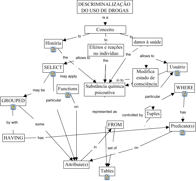 Esse mapa conceitual, produzido no IHMC CmapTools, tem a informação relacionada a: SQL map, SELECT may be GROUPED, Conceito to Efeitos e reações no indivíduo, danos à saúde the Substância química psicoativa, HAVING has Predicate(s), Efeitos e reações no indivíduo the Substância química psicoativa, HAVING by with GROUPED, Substância química psicoativa represented as Tables, danos à saúde allows to Modifica estado de consciência, Modifica estado de consciência particular Usuário, WHERE has Predicate(s), danos à saúde allows to Usuário, GROUPED some Attribute(s), Conceito Substância química psicoativa, Usuário from Substância química psicoativa, Modifica estado de consciência in to Substância química psicoativa, DESCRIMINALIZAÇÃO DO USO DE DROGAS is a Conceito, FROM set of Tables, Attribute(s) in FROM, Conceito to História, FROM controlled by WHERE