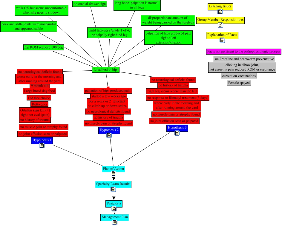 This Concept Map, created with IHMC CmapTools, has information related to: Case01_Group13, no cranial drawer sign Localized to hips, walk OK but seems uncomfortable when she goes to sit down Localized to hips, Hypothesis 3 Plan of Action, hip ROM reduced 100 deg Localized to hips, long bone palpation is normal in all legs Localized to hips, disproportionate amount of weight being carried on the forelegs Localized to hips, Plan of Action Specialty Exam Results, Hypothesis 1 Plan of Action, Specialty Exam Results Diagnosis, Localized to hips palpation of hips produced pain, Hypothesis 2 Plan of Action, mild lameness Grade 1 of 4, principally right hind leg Localized to hips, Localized to hips no neurological deficits found, Localized to hips no neurological deficits found, hock and stifle joints were nonpainful and appeared stable Localized to hips, Diagnosis Management Plan, palpation of hips produced pain right > left extension>flexion Localized to hips