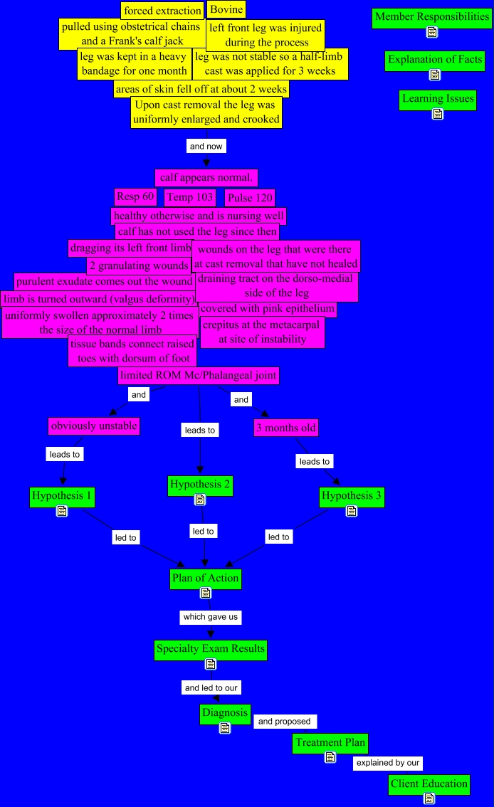 This Concept Map, created with IHMC CmapTools, has information related to: Case05_Group13, Specialty Exam Results and led to our Diagnosis, Hypothesis 1 led to Plan of Action, Plan of Action which gave us Specialty Exam Results, limited ROM Mc/Phalangeal joint leads to Hypothesis 2, 3 months old leads to Hypothesis 3, Treatment Plan explained by our Client Education, Diagnosis and proposed Treatment Plan, Hypothesis 3 led to Plan of Action, Upon cast removal the leg was uniformly enlarged and crooked and now calf appears normal., limited ROM Mc/Phalangeal joint and obviously unstable, Hypothesis 2 led to Plan of Action, limited ROM Mc/Phalangeal joint and 3 months old, obviously unstable leads to Hypothesis 1