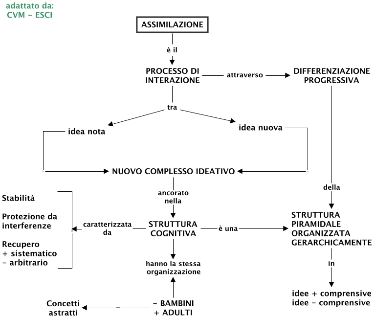 TEORIA DELL'ASSIMILAZIONE, ASSIMILAZIONE è il PROCESSO DI INTERAZIONE, idea nuova . NUOVO COMPLESSO IDEATIVO, idea nota . NUOVO COMPLESSO IDEATIVO, - BAMBINI + ADULTI _ Concetti astratti, DIFFERENZIAZIONE PROGRESSIVA della STRUTTURA PIRAMIDALE ORGANIZZATA GERARCHICAMENTE, PROCESSO DI INTERAZIONE tra idea nota, STRUTTURA PIRAMIDALE ORGANIZZATA GERARCHICAMENTE in idee + comprensive idee - comprensive, STRUTTURA COGNITIVA hanno la stessa organizzazione - BAMBINI + ADULTI, STRUTTURA COGNITIVA caratterizzata da Stabilità Protezione da interferenze Recupero + sistematico - arbitrario, PROCESSO DI INTERAZIONE tra idea nuova