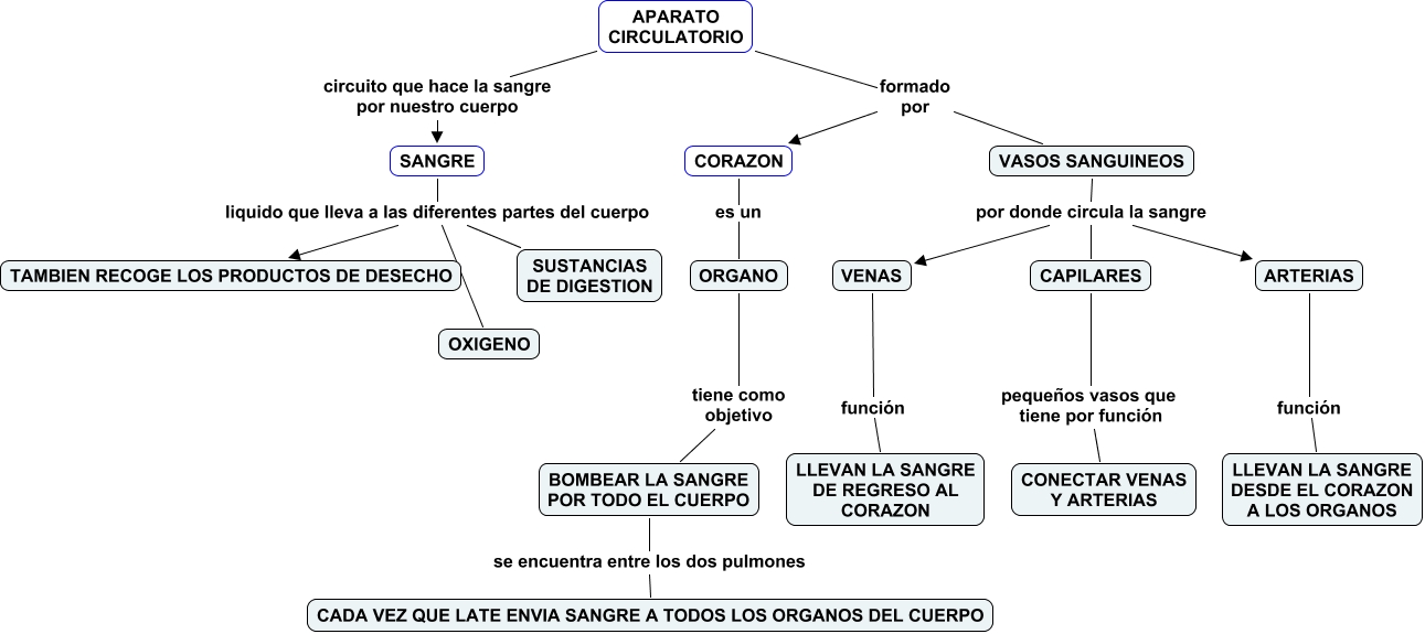 Este Cmap, tiene información relacionada con: aparato circulatorio, CAPILARES pequeños vasos que tiene por función CONECTAR VENAS Y ARTERIAS, CORAZON es un ORGANO, SANGRE liquido que lleva a las diferentes partes del cuerpo OXIGENO, VASOS SANGUINEOS por donde circula la sangre VENAS, VASOS SANGUINEOS por donde circula la sangre ARTERIAS, SANGRE liquido que lleva a las diferentes partes del cuerpo TAMBIEN RECOGE LOS PRODUCTOS DE DESECHO, APARATO CIRCULATORIO formado por CORAZON, BOMBEAR LA SANGRE POR TODO EL CUERPO se encuentra entre los dos pulmones CADA VEZ QUE LATE ENVIA SANGRE A TODOS LOS ORGANOS DEL CUERPO, APARATO CIRCULATORIO circuito que hace la sangre por nuestro cuerpo SANGRE, APARATO CIRCULATORIO formado por VASOS SANGUINEOS, ORGANO tiene como objetivo BOMBEAR LA SANGRE POR TODO EL CUERPO, ARTERIAS función LLEVAN LA SANGRE DESDE EL CORAZON A LOS ORGANOS, SANGRE liquido que lleva a las diferentes partes del cuerpo SUSTANCIAS DE DIGESTION, VASOS SANGUINEOS por donde circula la sangre CAPILARES, VENAS función LLEVAN LA SANGRE DE REGRESO AL CORAZON