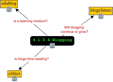 Este Cmap, tiene información relacionada con: 4.1.0.4 Blogging, 4.1.0.4 Blogging is blogs time-wasting? critics, 4.1.0.4 Blogging Will blogging continue to grow? blogsfuture, 4.1.0.4 Blogging is a learning medium? edublog