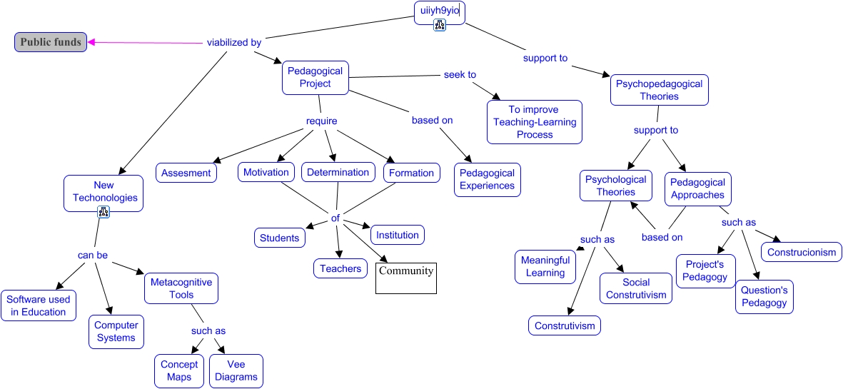 Este Cmap, tiene información relacionada con: Computer in Educaton, Determination of Students, Pedagogical Project based on Pedagogical Experiences, Psychopedagogical Theories support to Psychological Theories, uiiyh9yio viabilized by Public funds, Formation of Community, Formation of Institution, uiiyh9yio viabilized by New Techonologies, New Techonologies can be Software used in Education, Pedagogical Approaches based on Psychological Theories, Psychological Theories such as Meaningful Learning, Psychopedagogical Theories support to Pedagogical Approaches, Metacognitive Tools such as Vee Diagrams, Pedagogical Project require Formation, Metacognitive Tools such as Concept Maps, Psychological Theories such as Construtivism, Determination of Teachers, New Techonologies can be Metacognitive Tools, New Techonologies can be Computer Systems, Pedagogical Approaches such as Construcionism, Motivation of Teachers