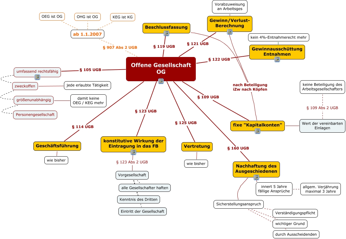 This Concept Map, created with IHMC CmapTools, has information related to: Offene Gesellschaft, größenunabhängig Personengesellschaft, Wert der vereinbarten Einlagen § 109 Abs 2 UGB keine Beteiligung des Arbeitsgesellschafters, umfassend rechtsfähig zweckoffen, Sicherstellungsanspruch wichtiger Grund, Offene Gesellschaft OG § 160 UGB Nachhaftung des Ausgeschiedenen, Beschlussfassung nach Beteiligung iZw nach Köpfen Gewinn/Verlust- Berechnung, ab 1.1.2007 OEG ist OG, fixe "Kapitalkonten" Wert der vereinbarten Einlagen, Sicherstellungsanspruch Verständigungspflicht, ab 1.1.2007 KEG ist KG, ab 1.1.2007 OHG ist OG, Offene Gesellschaft OG § 123 UGB konstitutive Wirkung der Eintragung in das FB, Beschlussfassung nach Beteiligung iZw nach Köpfen fixe "Kapitalkonten", Vorgesellschaft Eintritt der Gesellschaft, Offene Gesellschaft OG § 114 UGB Geschäftsführung, Offene Gesellschaft OG § 122 UGB Gewinnausschüttung Entnahmen, Vertretung wie bisher, Geschäftsführung wie bisher, Offene Gesellschaft OG § 119 UGB Beschlussfassung, Vorgesellschaft alle Gesellschafter haften