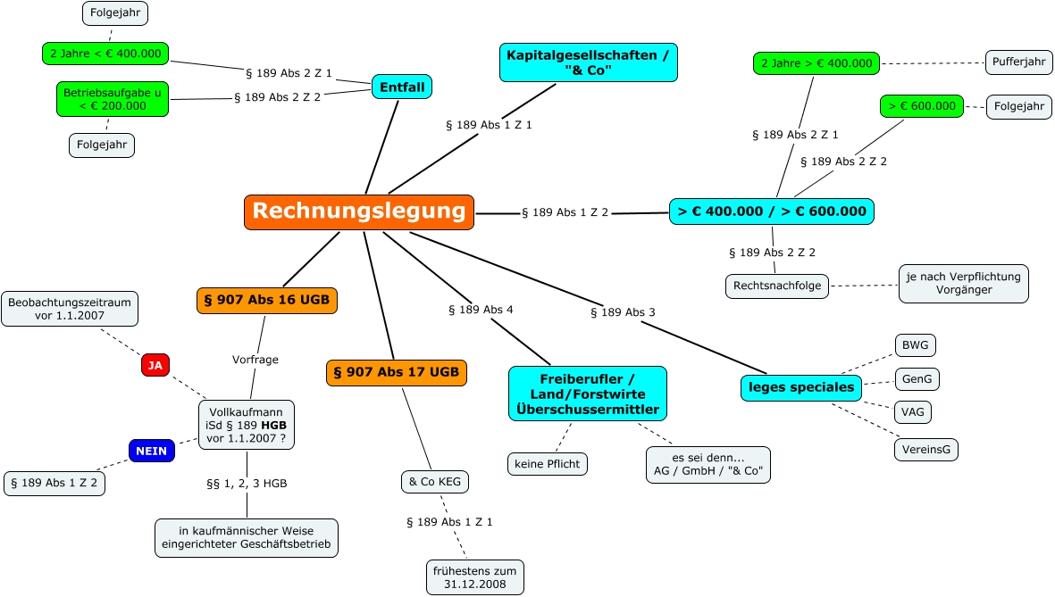 This Concept Map, created with IHMC CmapTools, has information related to: Rechnungslegung, & Co KEG § 189 Abs 1 Z 1 frühestens zum 31.12.2008, > € 600.000 Folgejahr, Rechnungslegung § 189 Abs 4 Freiberufler / Land/Forstwirte Überschussermittler, > € 400.000 / > € 600.000 § 189 Abs 2 Z 2 > € 600.000, Rechtsnachfolge je nach Verpflichtung Vorgänger, Rechnungslegung Entfall, Freiberufler / Land/Forstwirte Überschussermittler keine Pflicht, > € 400.000 / > € 600.000 § 189 Abs 2 Z 2 Rechtsnachfolge, Entfall § 189 Abs 2 Z 2 Betriebsaufgabe u < € 200.000, Vollkaufmann iSd § 189 HGB vor 1.1.2007 ? JA, leges speciales VAG, leges speciales BWG, > € 400.000 / > € 600.000 § 189 Abs 2 Z 1 2 Jahre > € 400.000, 2 Jahre < € 400.000 Folgejahr, Entfall § 189 Abs 2 Z 1 2 Jahre < € 400.000, Vollkaufmann iSd § 189 HGB vor 1.1.2007 ? §§ 1, 2, 3 HGB in kaufmännischer Weise eingerichteter Geschäftsbetrieb, Betriebsaufgabe u < € 200.000 Folgejahr, Rechnungslegung § 189 Abs 1 Z 1 Kapitalgesellschaften / "& Co", Rechnungslegung § 189 Abs 1 Z 2 > € 400.000 / > € 600.000, Freiberufler / Land/Forstwirte Überschussermittler es sei denn... AG / GmbH / "& Co"