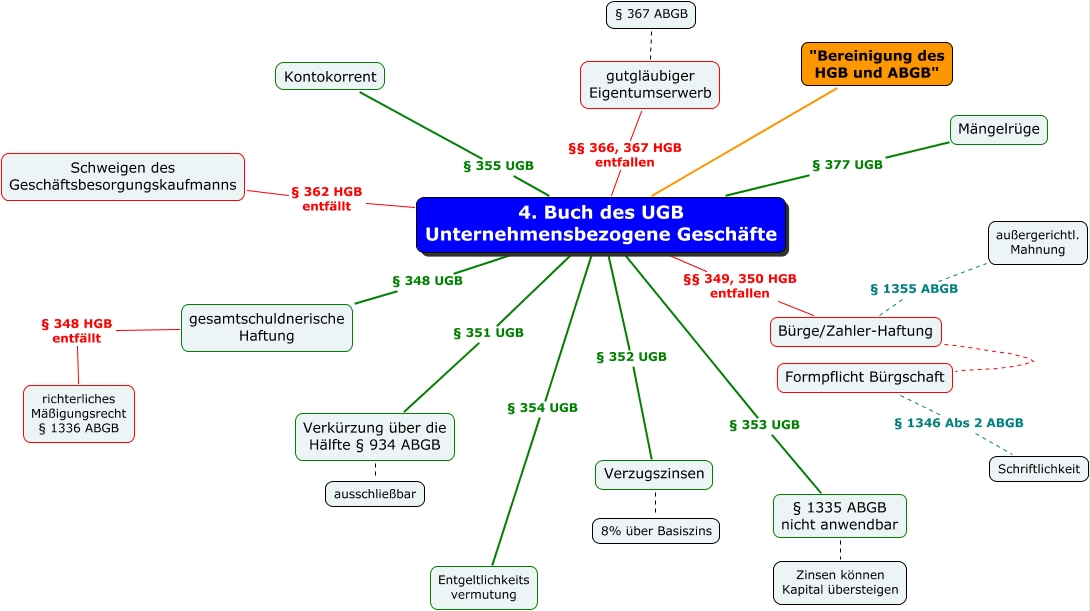 This Concept Map, created with IHMC CmapTools, has information related to: 4. Buch des UGB, Verkürzung über die Hälfte § 934 ABGB ausschließbar, 4. Buch des UGB Unternehmensbezogene Geschäfte §§ 366, 367 HGB entfallen gutgläubiger Eigentumserwerb, 4. Buch des UGB Unternehmensbezogene Geschäfte §§ 349, 350 HGB entfallen Bürge/Zahler-Haftung, gutgläubiger Eigentumserwerb § 367 ABGB, 4. Buch des UGB Unternehmensbezogene Geschäfte § 351 UGB Verkürzung über die Hälfte § 934 ABGB, gesamtschuldnerische Haftung § 348 HGB entfällt richterliches Mäßigungsrecht § 1336 ABGB, 4. Buch des UGB Unternehmensbezogene Geschäfte § 355 UGB Kontokorrent, 4. Buch des UGB Unternehmensbezogene Geschäfte § 348 UGB gesamtschuldnerische Haftung, 4. Buch des UGB Unternehmensbezogene Geschäfte § 362 HGB entfällt Schweigen des Geschäftsbesorgungskaufmanns, Formpflicht Bürgschaft § 1346 Abs 2 ABGB Schriftlichkeit, Verzugszinsen 8% über Basiszins, 4. Buch des UGB Unternehmensbezogene Geschäfte "Bereinigung des HGB und ABGB", Bürge/Zahler-Haftung Formpflicht Bürgschaft, 4. Buch des UGB Unternehmensbezogene Geschäfte § 354 UGB Entgeltlichkeits vermutung, Bürge/Zahler-Haftung § 1355 ABGB außergerichtl. Mahnung, 4. Buch des UGB Unternehmensbezogene Geschäfte § 377 UGB Mängelrüge, 4. Buch des UGB Unternehmensbezogene Geschäfte § 353 UGB § 1335 ABGB nicht anwendbar, 4. Buch des UGB Unternehmensbezogene Geschäfte § 352 UGB Verzugszinsen, § 1335 ABGB nicht anwendbar Zinsen können Kapital übersteigen