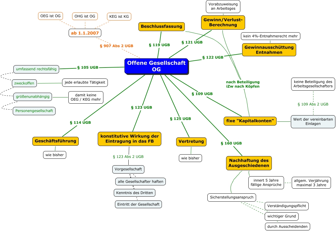 This Concept Map, created with IHMC CmapTools, has information related to: Offene Gesellschaft, größenunabhängig Personengesellschaft, Wert der vereinbarten Einlagen § 109 Abs 2 UGB keine Beteiligung des Arbeitsgesellschafters, umfassend rechtsfähig zweckoffen, Sicherstellungsanspruch wichtiger Grund, Offene Gesellschaft OG § 160 UGB Nachhaftung des Ausgeschiedenen, Beschlussfassung nach Beteiligung iZw nach Köpfen Gewinn/Verlust- Berechnung, ab 1.1.2007 OEG ist OG, fixe "Kapitalkonten" Wert der vereinbarten Einlagen, Sicherstellungsanspruch Verständigungspflicht, ab 1.1.2007 KEG ist KG, ab 1.1.2007 OHG ist OG, Offene Gesellschaft OG § 123 UGB konstitutive Wirkung der Eintragung in das FB, Beschlussfassung nach Beteiligung iZw nach Köpfen fixe "Kapitalkonten", Vorgesellschaft Eintritt der Gesellschaft, Offene Gesellschaft OG § 114 UGB Geschäftsführung, Offene Gesellschaft OG § 122 UGB Gewinnausschüttung Entnahmen, Vertretung wie bisher, Geschäftsführung wie bisher, Offene Gesellschaft OG § 119 UGB Beschlussfassung, Vorgesellschaft alle Gesellschafter haften
