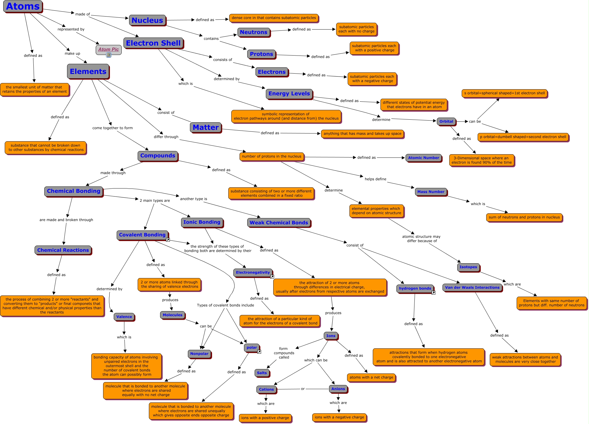 This Concept Map, created with IHMC CmapTools, has information related to: Chapter 2-Matt S-DBrown, Ionic Bonding the strength of these types of bonding both are determined by their Electronegativity, Ionic Bonding defined as the attraction of 2 or more atoms through differences in electrical charge, usually after electrons from respective atoms are exchanged, Chemical Reactions defined as the process of combining 2 or more "reactants" and converting them to "products" or final componets that have different chemical and/or physical properties than the reactants, the attraction of 2 or more atoms through differences in electrical charge, usually after electrons from respective atoms are exchanged produces Ions, Covalent Bonding Types of covalent bonds include polar, Weak Chemical Bonds consist of hydrogen bonds, Neutrons defined as subatomic particles each with no charge, Compounds made through Chemical Bonding, Mass Number which is sum of neutrons and protons in nucleus, Orbital can be p orbital=dumbell shaped=second electron shell, Chemical Bonding are made and broken through Chemical Reactions, Electron Shell consists of Electrons, Anions which are ions with a negative charge, polar defined as molecule that is bonded to another molecule where electrons are shared unequally which gives opposite ends opposite charge, Van der Waals Interactions defined as weak attractions between atoms and molecules are very close together, Ions which can be Cations, Nucleus contains Neutrons, Elements differ through number of protons in the nucleus, Nonpolar defined as molecule that is bonded to another molecule where electrons are shared equally with no net charge, elemental properties which depend on atomic structure atomic structure may differ because of Isotopes