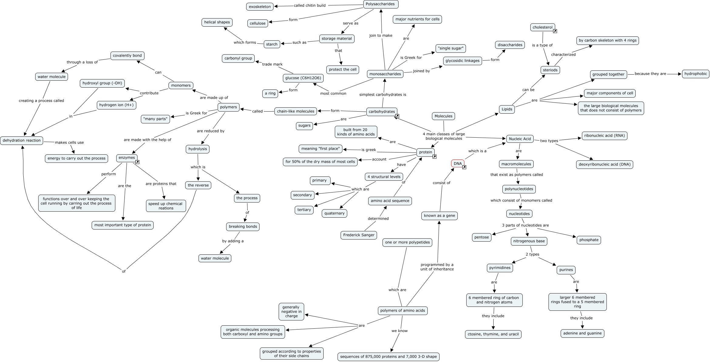 This Concept Map, created with IHMC CmapTools, has information related to: Chapter 5 Amanda, 4 structural levels which are secondary, storage material such as starch, enzymes are the most important type of protein, protein is greek meaning "first place", hydroxyl group (-OH) in dehydration reaction, water molecule creating a process called dehydration reaction, dehydration reaction makes cells use energy to carry out the process, glucose (C6H12O6) form a ring, polymers of amino acids are grouped according to properties of their side chains, pyrimidines are 6 membered ring of carbon and nitrogen atoms, storage material that protect the cell, hydrolysis which is the reverse, polymers is Greek for "many parts", polymers are made up of monomers, enzymes are proteins that speed up chemical reations, hydrolysis which is the process, protein have 4 structural levels, polymers are made with the help of enzymes, nucleotides 3 parts of nucleotides are pentose, polymers are reduced by hydrolysis