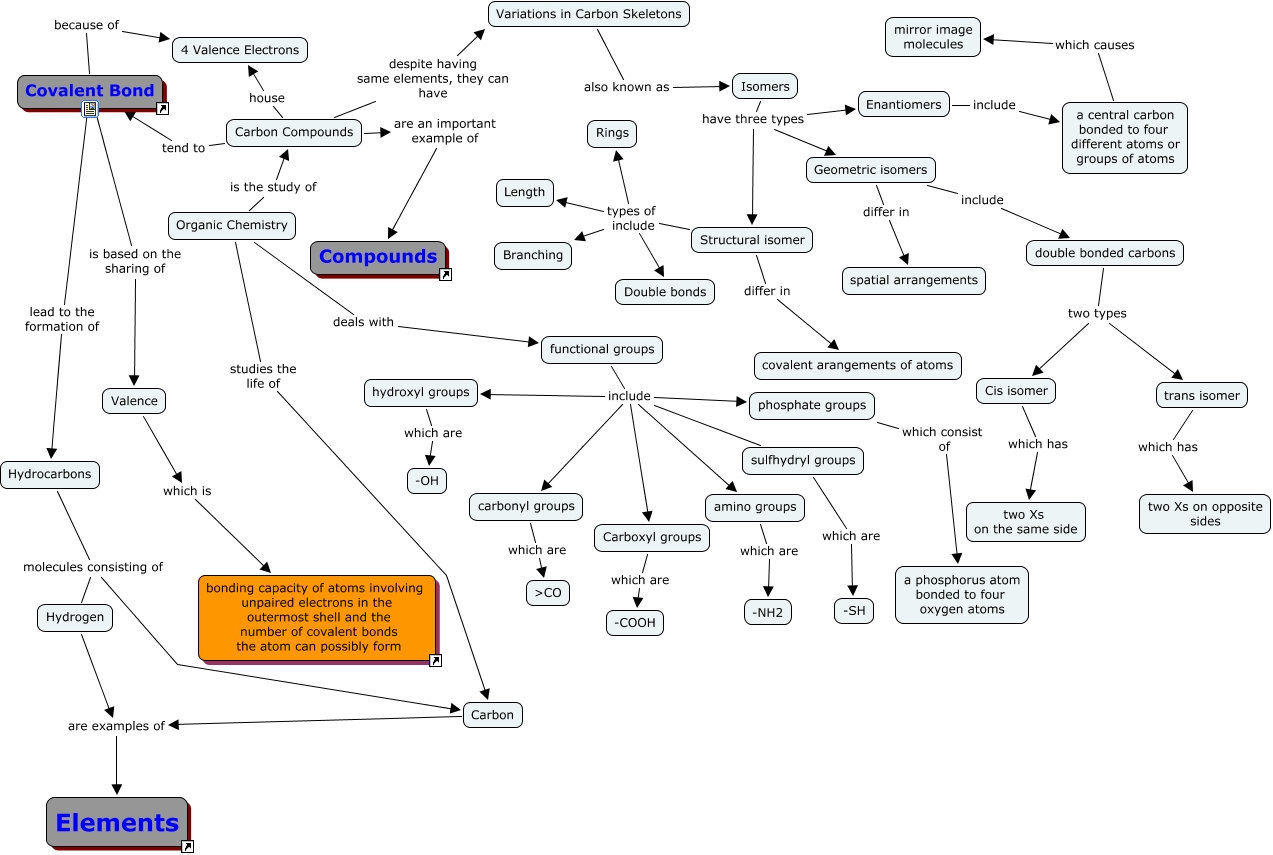 This Concept Map, created with IHMC CmapTools, has information related to: chapter 4-Jeff change, Covalent Bond because of 4 Valence Electrons, Structural isomer types of include Length, functional groups include carbonyl groups, Organic Chemistry studies the life of Carbon, Structural isomer types of include Double bonds, Isomers have three types Structural isomer, Hydrocarbons molecules consisting of Carbon, Carbon Compounds tend to Covalent Bond, sulfhydryl groups which are -SH, trans isomer which has two Xs on opposite sides, double bonded carbons two types Cis isomer, Hydrocarbons molecules consisting of Hydrogen, Structural isomer differ in covalent arangements of atoms, double bonded carbons two types trans isomer, Carboxyl groups which are -COOH, Structural isomer types of include Branching, functional groups include sulfhydryl groups, functional groups include phosphate groups, Structural isomer types of include Rings, Enantiomers include a central carbon bonded to four different atoms or groups of atoms