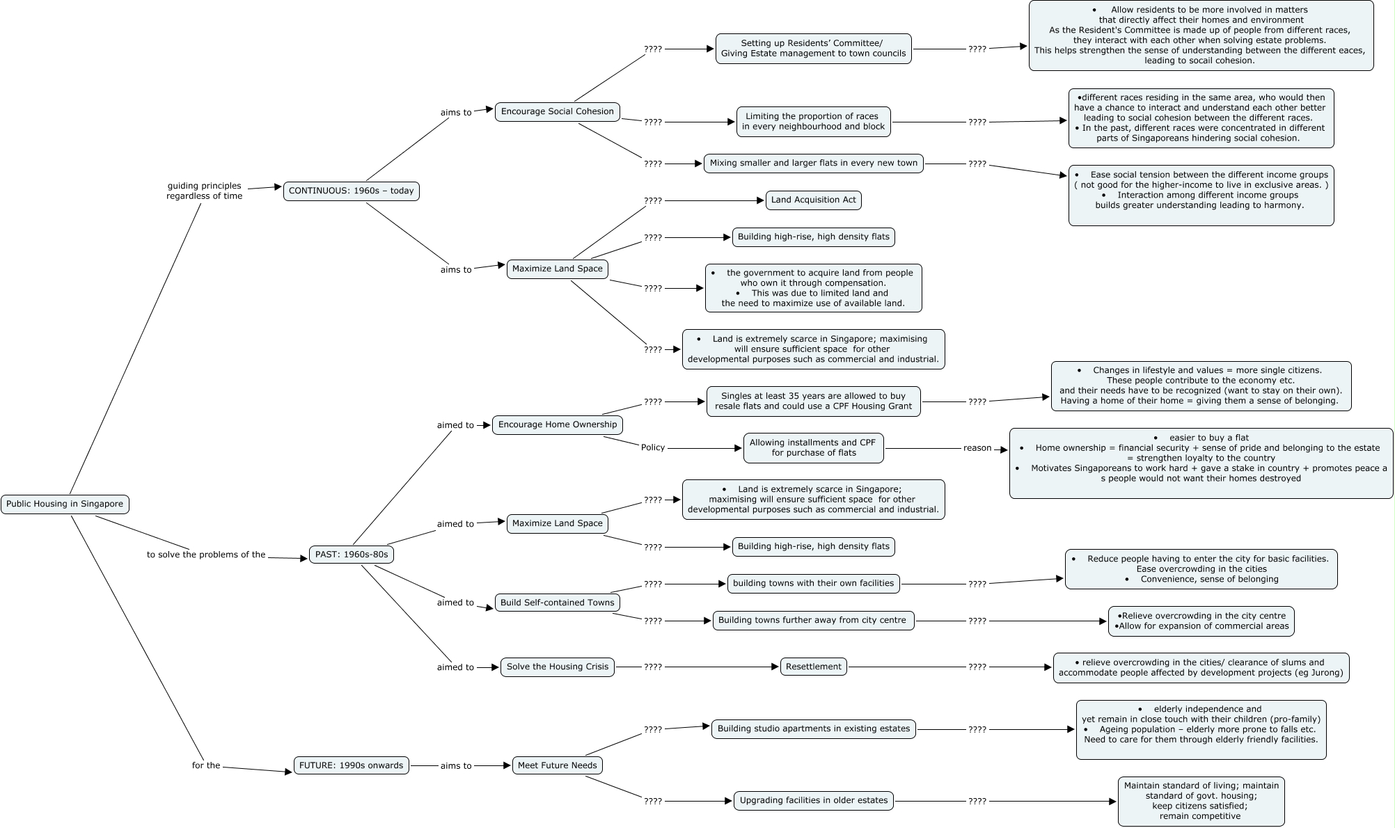 This Concept Map, created with IHMC CmapTools, has information related to: ChuanZ, Public Housing in Singapore for the FUTURE: 1990s onwards, PAST: 1960s-80s aimed to Build Self-contained Towns, Build Self-contained Towns ???? Building towns further away from city centre, Encourage Home Ownership Policy Allowing installments and CPF for purchase of flats, Limiting the proportion of races in every neighbourhood and block ???? •different races residing in the same area, who would then have a chance to interact and understand each other better leading to social cohesion between the different races. • In the past, different races were concentrated in different parts of Singaporeans hindering social cohesion., Build Self-contained Towns ???? building towns with their own facilities, Upgrading facilities in older estates ???? Maintain standard of living; maintain standard of govt. housing; keep citizens satisfied; remain competitive, CONTINUOUS: 1960s – today aims to Encourage Social Cohesion, Maximize Land Space ???? Building high-rise, high density flats, Mixing smaller and larger flats in every new town ???? • Ease social tension between the different income groups ( not good for the higher-income to live in exclusive areas. ) • Interaction among different income groups builds greater understanding leading to harmony., Encourage Social Cohesion ???? Setting up Residents’ Committee/ Giving Estate management to town councils, Setting up Residents’ Committee/ Giving Estate management to town councils ???? • Allow residents to be more involved in matters that directly affect their homes and environment As the Resident's Committee is made up of people from different races, they interact with each other when solving estate problems. This helps strengthen the sense of understanding between the different eaces, leading to socail cohesion., Encourage Home Ownership ???? Singles at least 35 years are allowed to buy resale flats and could use a CPF Housing Grant, Public Housing in Singapore to solve the problems of the PAST: 1960s-80s, Solve the Housing Crisis ???? Resettlement, building towns with their own facilities ???? • Reduce people having to enter the city for basic facilities. Ease overcrowding in the cities • Convenience, sense of belonging, Maximize Land Space ???? • Land is extremely scarce in Singapore; maximising will ensure sufficient space for other developmental purposes such as commercial and industrial., Public Housing in Singapore guiding principles regardless of time CONTINUOUS: 1960s – today, PAST: 1960s-80s aimed to Maximize Land Space, PAST: 1960s-80s aimed to Solve the Housing Crisis