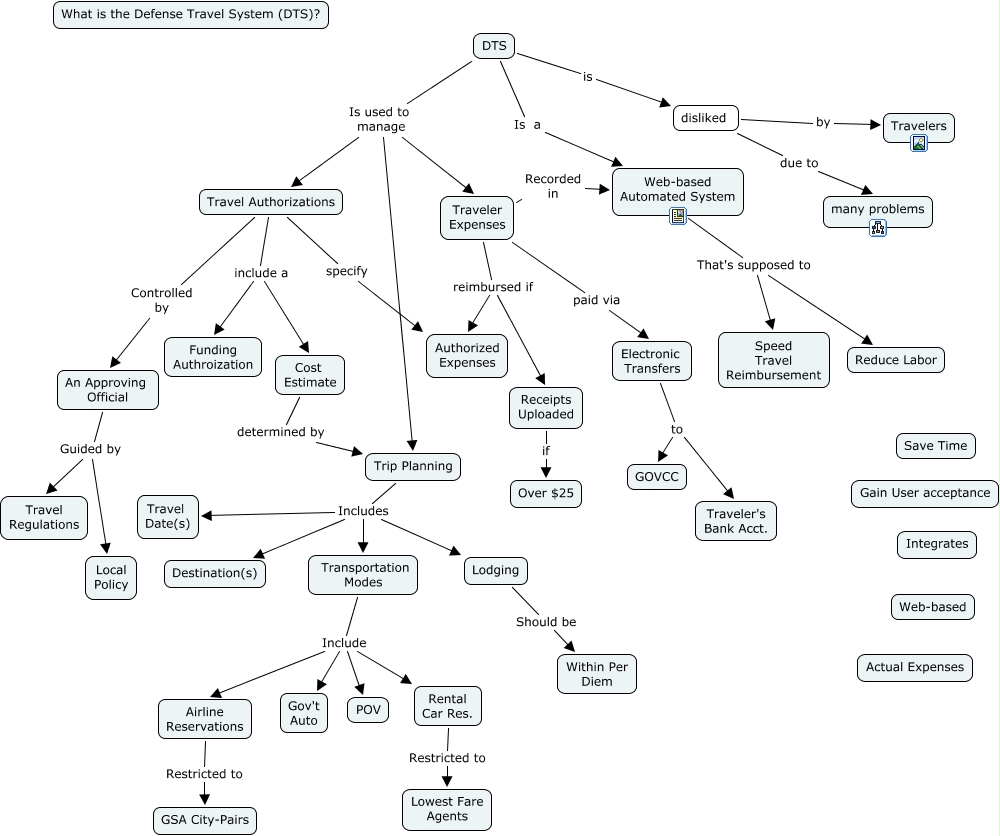This Concept Map, created with IHMC CmapTools, has information related to: DTS, DTS Is used to manage Travel Authorizations, Cost Estimate determined by Trip Planning, Transportation Modes Include Airline Reservations, Rental Car Res. Restricted to Lowest Fare Agents, disliked due to many problems, Trip Planning Includes Lodging, Trip Planning Includes Travel Date(s), An Approving Official Guided by Travel Regulations, Traveler Expenses Recorded in Web-based Automated System, Traveler Expenses reimbursed if Authorized Expenses, Receipts Uploaded if Over $25, Traveler Expenses reimbursed if Receipts Uploaded, Airline Reservations Restricted to GSA City-Pairs, Travel Authorizations Controlled by An Approving Official, DTS Is used to manage Traveler Expenses, Electronic Transfers to GOVCC, DTS Is used to manage Trip Planning, Travel Authorizations include a Cost Estimate, Travel Authorizations include a Funding Authroization, DTS Is a Web-based Automated System