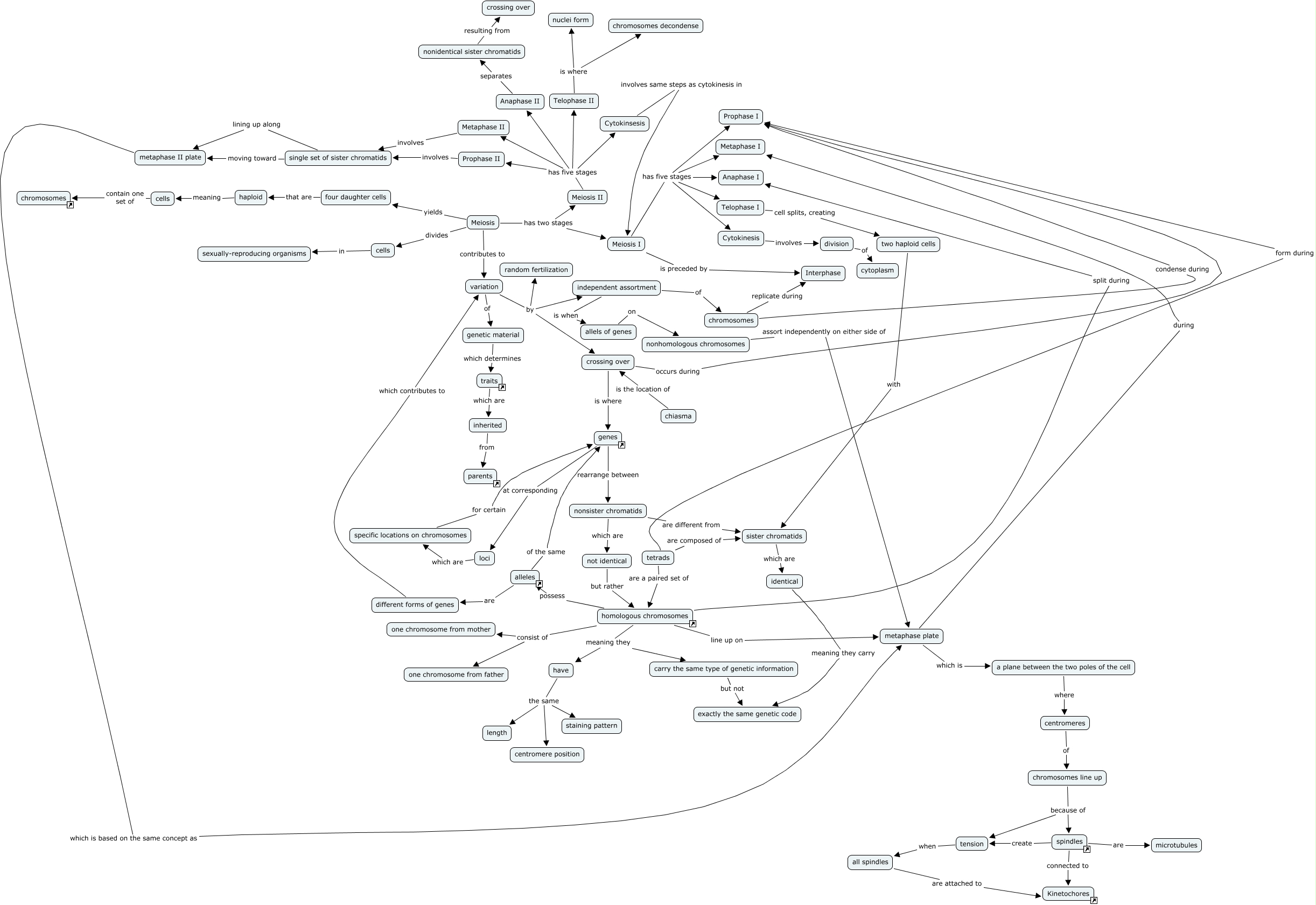 This Concept Map, created with IHMC CmapTools, has information related to: Chapter 13 Kelsey, cells in sexually-reproducing organisms, Telophase II is where chromosomes decondense, chromosomes line up because of tension, not identical but rather homologous chromosomes, Prophase II involves single set of sister chromatids, tension when all spindles, all spindles are attached to Kinetochores, haploid meaning cells, have the same centromere position, Meiosis II has five stages Cytokinsesis, crossing over occurs during Prophase I, nonhomologous chromosomes assort independently on either side of metaphase plate, alleles of the same genes, identical meaning they carry exactly the same genetic code, Meiosis II has five stages Metaphase II, nonsister chromatids are different from sister chromatids, spindles connected to Kinetochores, genes at corresponding loci, variation by random fertilization, Meiosis I has five stages Metaphase I
