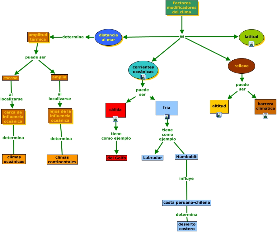 Este Cmap, tiene información relacionada con: Factores modificadores del clima, corrientes oceánicas puede ser fría, cerca de influencia oceànica determina climas oceánicos, fría tiene como ejemplo Humboldt, costa peruano-chilena determina desierto costero, Factores modificadores del clima es latitud, Factores modificadores del clima es distancia al mar, escasa al localizarse cerca de influencia oceànica, lejos de la influencia oceánica determina climas continentales, relieve puede ser barrera climática, amplitud térmica puede ser escasa, amplia al localizarse lejos de la influencia oceánica, relieve puede ser altitud, distancia al mar determina amplitud térmica, amplitud térmica puede ser amplia, fría tiene como ejemplo Labrador, Humboldt influye costa peruano-chilena, Factores modificadores del clima es corrientes oceánicas, corrientes oceánicas puede ser cálida, Factores modificadores del clima es relieve, cálida tiene como ejemplo del Golfo