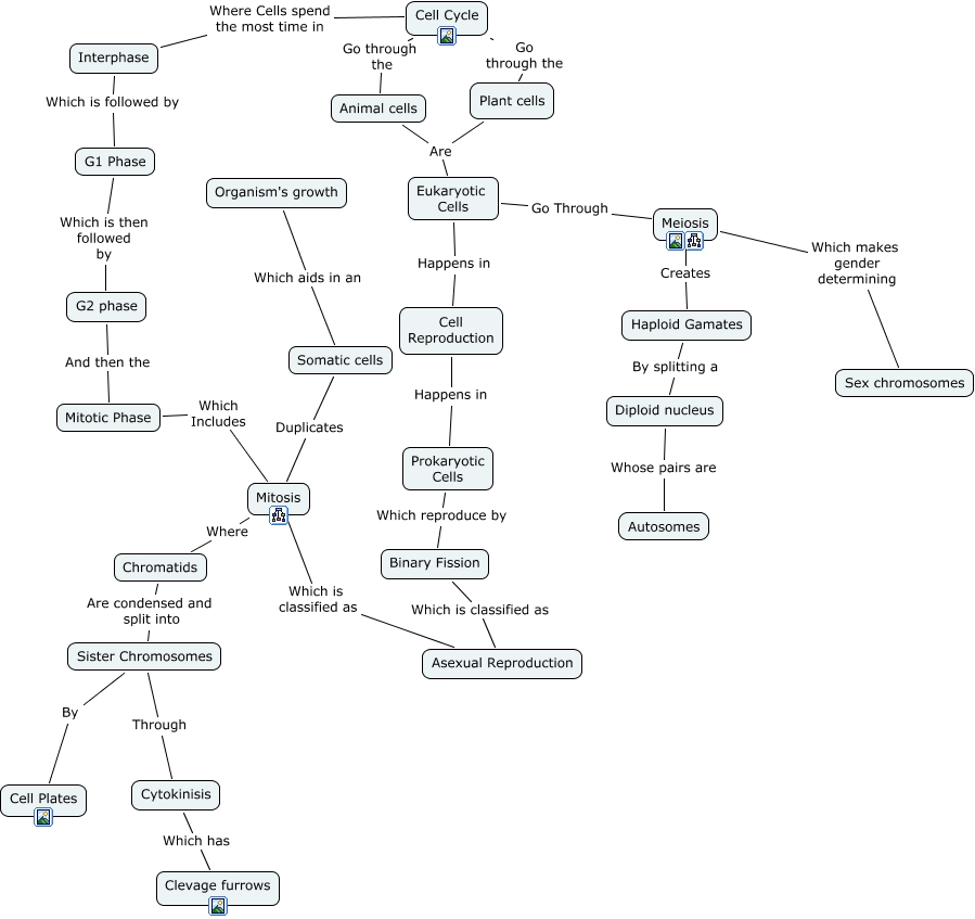 This Concept Map, created with IHMC CmapTools, has information related to: Cellrepro BH, Eukaryotic Cells Are Plant cells, Mitosis Duplicates Somatic cells, Sister Chromosomes Through Cytokinisis, G1 Phase Which is then followed by G2 phase, Cell Reproduction Happens in Prokaryotic Cells, Cell Cycle Where Cells spend the most time in Interphase, Mitotic Phase Which Includes Mitosis, Haploid Gamates By splitting a Diploid nucleus, G2 phase And then the Mitotic Phase, Mitosis Where Chromatids, Cytokinisis Which has Clevage furrows, Plant cells Go through the Cell Cycle, Chromatids Are condensed and split into Sister Chromosomes, Interphase Which is followed by G1 Phase, Sister Chromosomes By Cell Plates, Prokaryotic Cells Which reproduce by Binary Fission, Eukaryotic Cells Go Through Meiosis, Meiosis Creates Haploid Gamates, Somatic cells Which aids in an Organism's growth, Binary Fission Which is classified as Asexual Reproduction