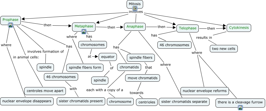 This Concept Map, created with IHMC CmapTools, has information related to: Mitosis KC, Cytokinesis results in two new cells, Mitosis involves Cytokinesis, Prophase involves formation of spindle, Anaphase has chromatids, Mitosis involves Metaphase, Prophase where nuclear envelope disappears, move chromatids towards centrioles, equator of spindle, Mitosis involves Telophase, chromatids each with a copy of a chromosome, Prophase in animal cells: centroles move apart, spindle fibers that move chromatids, 46 chromosomes with sister chromatids present, chromosomes at equator, Mitosis involves Anaphase, Metaphase then Anaphase, Metaphase has chromosomes, Anaphase then Telophase, Telophase has 46 chromosomes, Prophase has 46 chromosomes