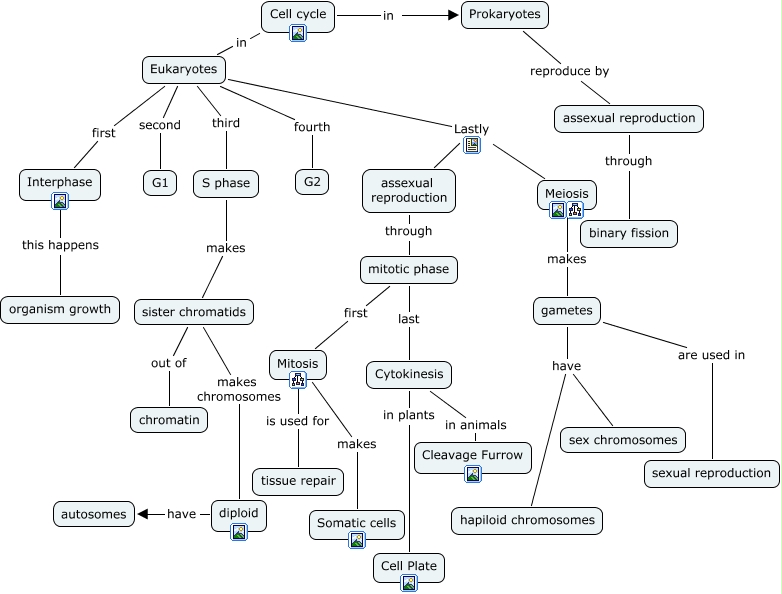 This Concept Map, created with IHMC CmapTools, has information related to: cell cycle, mitotic phase last Cytokinesis, mitotic phase first Mitosis, Interphase this happens organism growth, gametes have hapiloid chromosomes, Mitosis is used for tissue repair, Mitosis makes Somatic cells, sister chromatids makes chromosomes diploid, Eukaryotes first Interphase, Prokaryotes reproduce by assexual reproduction, S phase makes sister chromatids, Eukaryotes second G1, gametes have sex chromosomes, Eukaryotes Lastly assexual reproduction, Cell cycle in Eukaryotes, assexual reproduction through binary fission, Cytokinesis in animals Cleavage Furrow, gametes are used in sexual reproduction, Eukaryotes Lastly Meiosis, Cytokinesis in plants Cell Plate, Eukaryotes third S phase