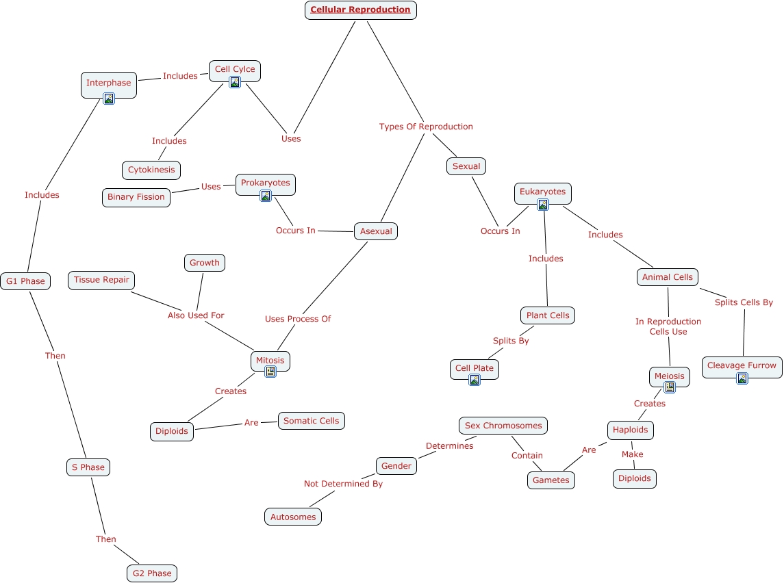 This Concept Map, created with IHMC CmapTools, has information related to: Cell Repro, Eukaryotes Includes Animal Cells, Mitosis Also Used For Growth, Animal Cells Splits Cells By Cleavage Furrow, Animal Cells In Reproduction Cells Use Meiosis, Cellular Reproduction Uses Cell Cylce, Cell Cylce Includes Cytokinesis, Mitosis Also Used For Tissue Repair, Asexual Occurs In Prokaryotes, G1 Phase Then S Phase, Interphase Includes G1 Phase, Gender Not Determined By Autosomes, Cellular Reproduction Types Of Reproduction Asexual, Asexual Uses Process Of Mitosis, Sexual Occurs In Eukaryotes, S Phase Then G2 Phase, Diploids Are Somatic Cells, Cell Cylce Includes Interphase, Haploids Make Diploids, Eukaryotes Includes Plant Cells, Haploids Are Gametes