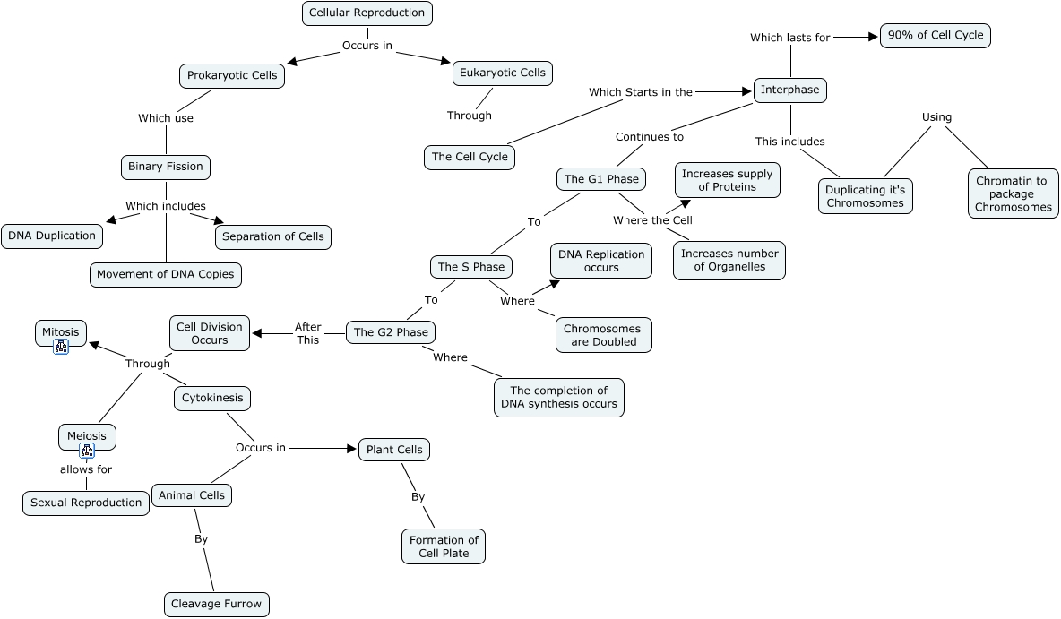 This Concept Map, created with IHMC CmapTools, has information related to: Cell Repro DE, The G1 Phase Where the Cell Increases supply of Proteins, Cell Division Occurs Through Cytokinesis, Plant Cells By Formation of Cell Plate, Binary Fission Which includes Movement of DNA Copies, Cell Division Occurs Through Mitosis, Cytokinesis Occurs in Plant Cells, The G1 Phase To The S Phase, The G2 Phase After This Cell Division Occurs, The G1 Phase Where the Cell Increases number of Organelles, Interphase Which lasts for 90% of Cell Cycle, The S Phase Where Chromosomes are Doubled, Cell Division Occurs Through Meiosis, Prokaryotic Cells Which use Binary Fission, The G2 Phase Where The completion of DNA synthesis occurs, The S Phase Where DNA Replication occurs, Duplicating it's Chromosomes Using Chromatin to package Chromosomes, The Cell Cycle Which Starts in the Interphase, Cellular Reproduction Occurs in Prokaryotic Cells, Interphase Continues to The G1 Phase, Cytokinesis Occurs in Animal Cells
