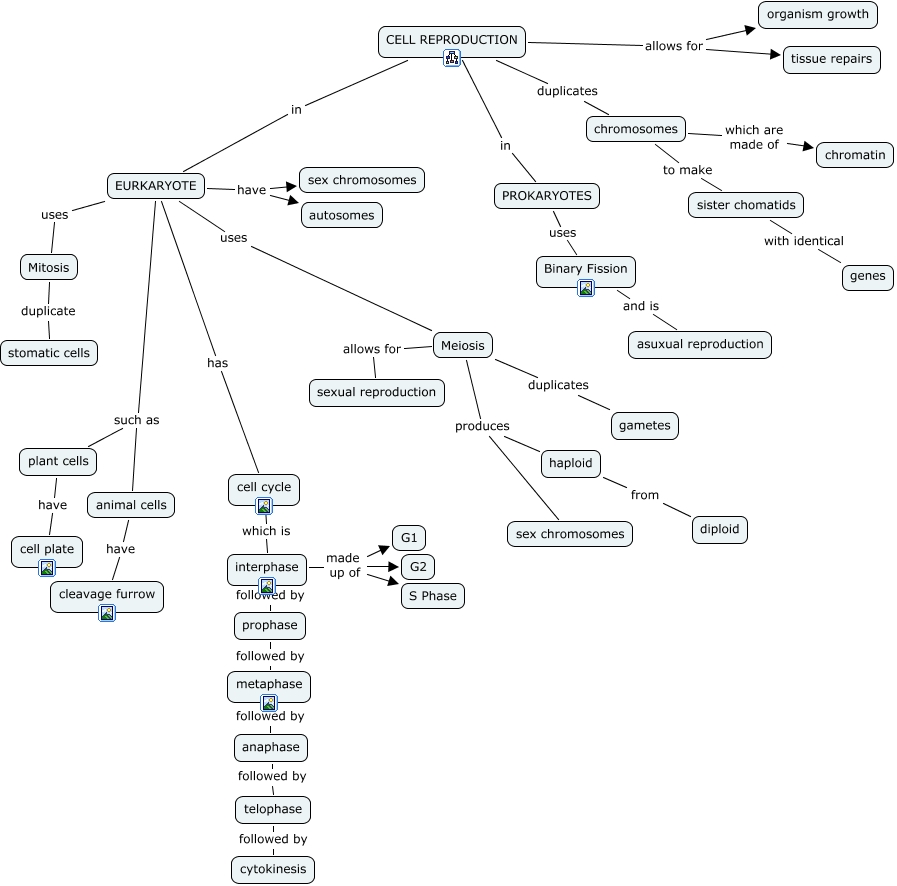 This Concept Map, created with IHMC CmapTools, has information related to: Sophia Leone cmap, chromosomes which are made of chromatin, animal cells have cleavage furrow, EURKARYOTE uses Meiosis, metaphase followed by anaphase, prophase followed by metaphase, PROKARYOTES uses Binary Fission, Meiosis duplicates gametes, Meiosis allows for sexual reproduction, CELL REPRODUCTION in PROKARYOTES, interphase made up of S Phase, Meiosis produces haploid, chromosomes to make sister chomatids, sister chomatids with identical genes, EURKARYOTE such as plant cells, plant cells have cell plate, interphase made up of G2, EURKARYOTE have sex chromosomes, anaphase followed by telophase, interphase made up of G1, Meiosis produces sex chromosomes