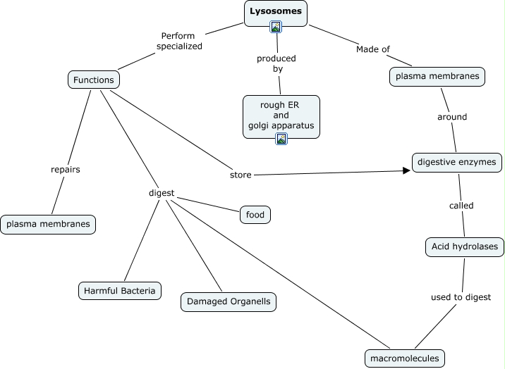 This Concept Map, created with IHMC CmapTools, has information related to: lysosomes red, Lysosomes produced by rough ER and golgi apparatus, Functions digest macromolecules, Functions store digestive enzymes, food digest Harmful Bacteria, food digest macromolecules, Functions digest Damaged Organells, Acid hydrolases used to digest macromolecules, Lysosomes Made of plasma membranes, digestive enzymes called Acid hydrolases, Functions digest Harmful Bacteria, Functions repairs plasma membranes, plasma membranes around digestive enzymes, food digest Damaged Organells