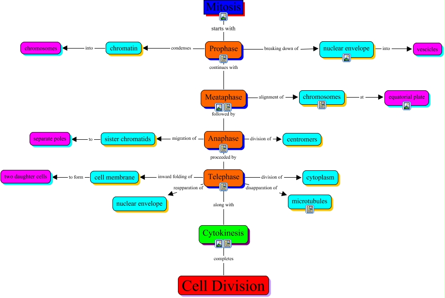 This Concept Map, created with IHMC CmapTools, has information related to: Mitosis + RS, Telephase along with Cytokinesis, Cytokinesis completes Cell Division, cell membrane to form two daughter cells, Prophase condenses chromatin, chromosomes at equatorial plate, sister chromatids to separate poles, nuclear envelope into vescicles, Telephase disapparation of microtubules, Anaphase proceeded by Telephase, chromatin into chromosomes, Telephase reapparation of nuclear envelope, Prophase continues with Meataphase, Prophase breaking down of nuclear envelope, Telephase division of cytoplasm, Anaphase migration of sister chromatids, Mitosis starts with Prophase, Meataphase followed by Anaphase, Telephase inward folding of cell membrane, Meataphase alignment of chromosomes, Anaphase division of centromers