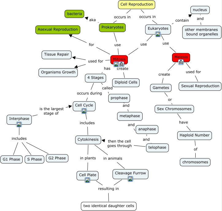 This Concept Map, created with IHMC CmapTools, has information related to: cell reproduction ch, Cytokinesis in plants Cell Plate, Eukaryotes use Meiosis, Haploid Number of chromosomes, metaphase and anaphase, anaphase and telophase, Eukaryotes contain nucleus, Meiosis create Gametes, 4 Stages called prophase, prophase and metaphase, Interphase includes G2 Phase, Mitosis has 4 Stages, Interphase includes G1 Phase, Interphase is the largest stage of Cell Cycle, Cell Cycle includes Cytokinesis, Eukaryotes use Mitosis, Prokaryotes aka bacteria, Sex Chromosomes have Haploid Number, Gametes or Sex Chromosomes, Cell Reproduction occurs in Prokaryotes, telophase then the cell goes through Cytokinesis