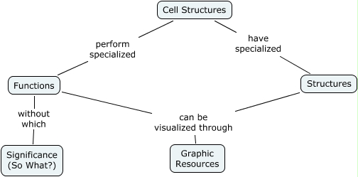 This Concept Map, created with IHMC CmapTools, has information related to: Cell Structure Template, Cell Structures have specialized Structures, Structures can be visualized through Graphic Resources, Functions can be visualized through Graphic Resources, Cell Structures perform specialized Functions, Functions without which Significance (So What?)