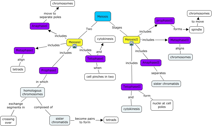 This Concept Map, created with IHMC CmapTools, has information related to: Meiosis EH, MeiosisII includes MetaphaseII, Meiosis Stages MeiosisII, spindle to move chromosomes, Meiosis Two MeiosisI, MeiosisI includes AnaphaseI, MeiosisII includes AnaphaseII, MeiosisI includes ProphaseI, TelophaseII and cytokinesis, TelophaseI when cell pinches in two, MeiosisII includes TelophaseII, TelophaseII form nuclei at cell poles, prophaseII forms spindle, AnaphaseI move to separate poles chromosomes, homologous chromosomes exchange segments in crossing over, ProphaseI in which homologous chromosomes, AnaphaseII separates sister chromatids, MeiosisI includes TelophaseI, TelophaseI and cytokinesis, MeiosisI includes MetaphaseI, MeiosisII includes prophaseII