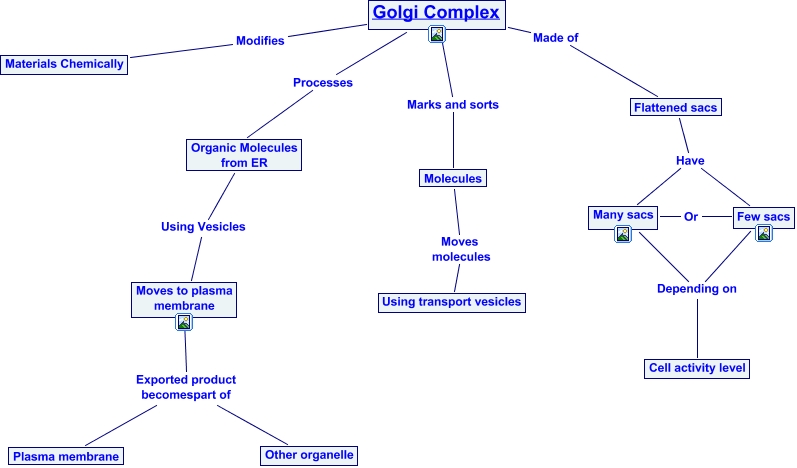 This Concept Map, created with IHMC CmapTools, has information related to: GolgiComplexBlue, Golgi Complex Marks and sorts Molecules, Organic Molecules from ER Using Vesicles Moves to plasma membrane, Flattened sacs Have Many sacs, Many sacs Depending on Cell activity level, Moves to plasma membrane Exported product becomespart of Other organelle, Golgi Complex Made of Flattened sacs, Many sacs Or Few sacs, Flattened sacs Have Few sacs, Few sacs Depending on Cell activity level, Golgi Complex Modifies Materials Chemically, Golgi Complex Processes Organic Molecules from ER, Molecules Moves molecules Using transport vesicles, Moves to plasma membrane Exported product becomespart of Plasma membrane