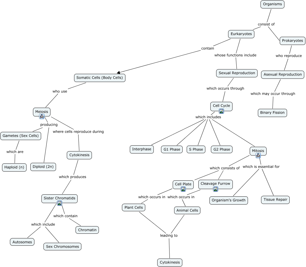 This Concept Map, created with IHMC CmapTools, has information related to: Cell Repro (REVISED), Eurkaryotes whose functions include Sexual Reproduction, Mitosis which consists of Cell Plate, Animal Cells leading to Cytokinesis, Plant Cells leading to Cytokinesis, Sister Chromatids which include Sex Chromosomes, Sister Chromatids which include Autosomes, Cell Cycle which includes Interphase, Sexual Reproduction which occurs through Cell Cycle, Cytokinesis which produces Sister Chromatids, Eurkaryotes contain Somatic Cells (Body Cells), Gametes (Sex Cells) which are Haploid (n), Sister Chromatids which contain Chromatin, Mitosis which is essential for Tissue Repair, Cleavage Furrow which occurs in Animal Cells, Asexual Reproduction which may occur through Binary Fission, Somatic Cells (Body Cells) who use Meiosis, Cell Cycle which includes S Phase, Organisms consist of Eurkaryotes, Mitosis which is essential for Organism's Growth, Organisms consist of Prokaryotes