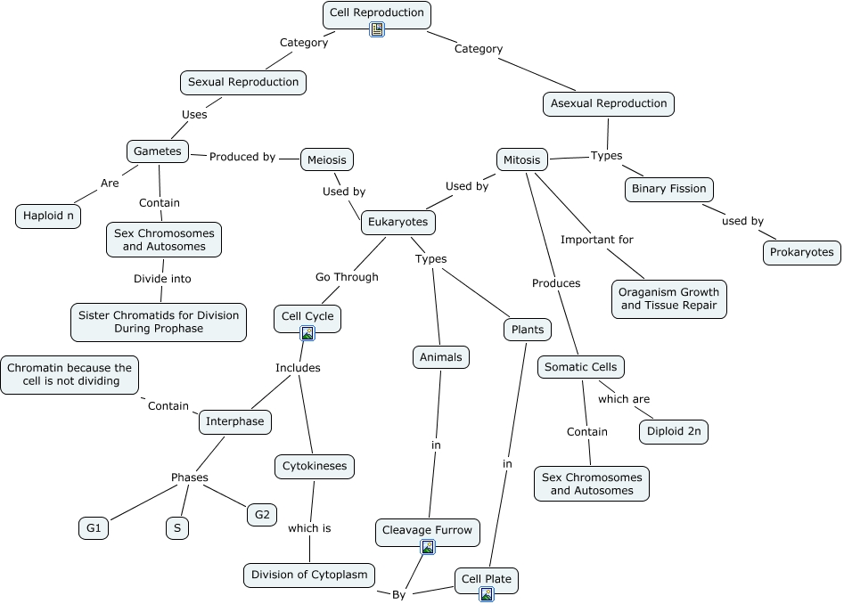 This Concept Map, created with IHMC CmapTools, has information related to: Cell Repro + ES GL, Somatic Cells Contain Sex Chromosomes and Autosomes, Meiosis Used by Eukaryotes, Eukaryotes Types Animals, Cell Reproduction Category Asexual Reproduction, Gametes Produced by Meiosis, Cell Reproduction Category Sexual Reproduction, Gametes Contain Sex Chromosomes and Autosomes, Division of Cytoplasm By Cleavage Furrow, Cell Cycle Includes Cytokineses, Sexual Reproduction Uses Gametes, Mitosis Produces Somatic Cells, Interphase Phases S, Asexual Reproduction Types Mitosis, Binary Fission used by Prokaryotes, Cell Cycle Includes Interphase, Division of Cytoplasm By Cell Plate, Plants in Cell Plate, Interphase Phases G2, Eukaryotes Types Plants, Gametes Are Haploid n