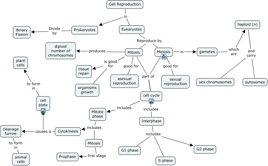 This Concept Map, created with IHMC CmapTools, has information related to: Cell repro JT, Mitosis is good for tissue repair, Eukaryotes Reproduce by Meiosis, cell cycle includes Interphase, Mitosis first stage Prophase, haploid (n) and carry sex chromosomes, Mitotic phase includes Cytokinesis, Cytokinesis causes a cell plate, Mitosis cell cycle, Meiosis good for sexual reproduction, Interphase includes G1 phase, Mitosis is good for organisms growth, Mitosis good for asexual reproduction, Interphase includes S phase, Meiosis in gametes, Interphase includes G2 phase, Cell Reproduction in Prokaryotes, Meiosis part of cell cycle, cell plate to form in plant cells, Prokaryotes Divide by Binary Fission, cell cycle includes Mitotic phase