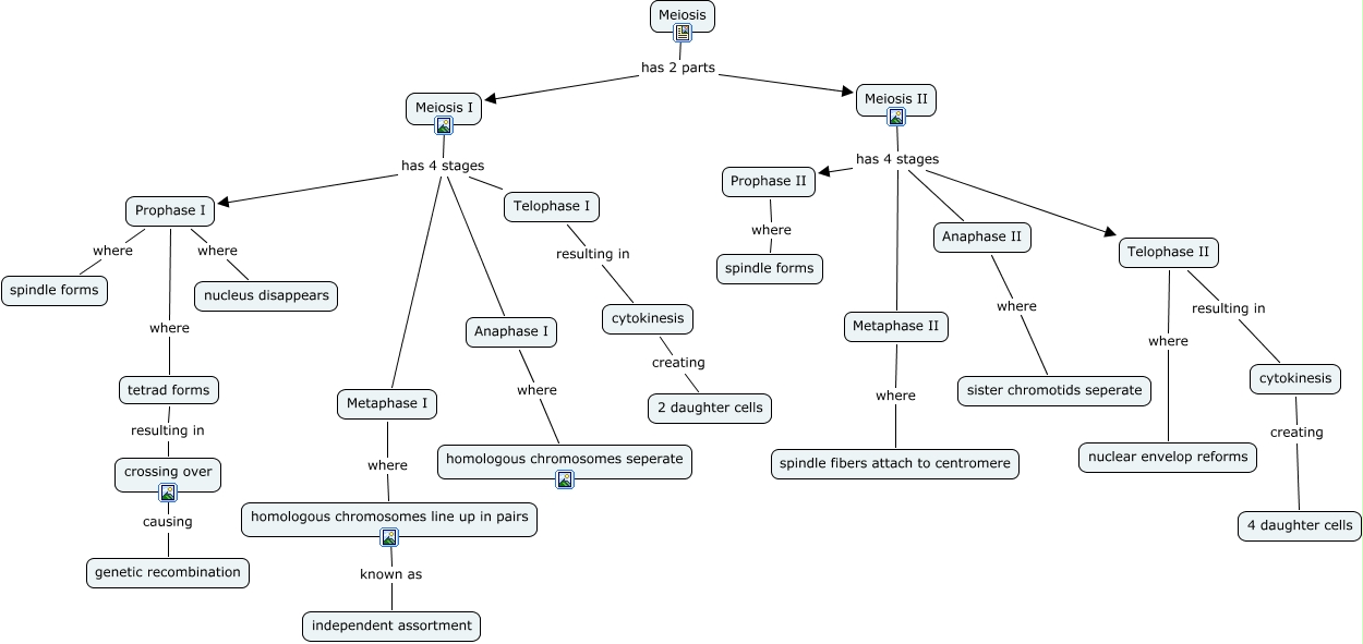 This Concept Map, created with IHMC CmapTools, has information related to: Meiosis, Meiosis has 2 parts Meiosis II, Meiosis I has 4 stages Metaphase I, Metaphase I where homologous chromosomes line up in pairs, homologous chromosomes line up in pairs known as independent assortment, Meiosis has 2 parts Meiosis I, tetrad forms resulting in crossing over, Meiosis I has 4 stages Anaphase I, Prophase I where nucleus disappears, Prophase I where tetrad forms, cytokinesis creating 4 daughter cells, Meiosis I has 4 stages Telophase I, cytokinesis creating 2 daughter cells, Anaphase II where sister chromotids seperate, Anaphase I where homologous chromosomes seperate, crossing over causing genetic recombination, Meiosis II has 4 stages Prophase II, Prophase I where spindle forms, Metaphase II where spindle fibers attach to centromere, Meiosis II has 4 stages Metaphase II, Telophase II resulting in cytokinesis