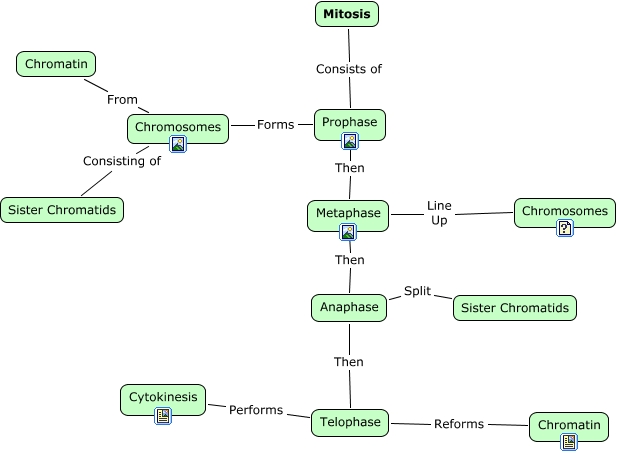This Concept Map, created with IHMC CmapTools, has information related to: Mitosis, Chromosomes From Chromatin, Metaphase Then Anaphase, Anaphase Split Sister Chromatids, Chromosomes Consisting of Sister Chromatids, Mitosis Consists of Prophase, Metaphase Line Up Chromosomes, Prophase Then Metaphase, Prophase Forms Chromosomes, Telophase Performs Cytokinesis, Anaphase Then Telophase, Telophase Reforms Chromatin