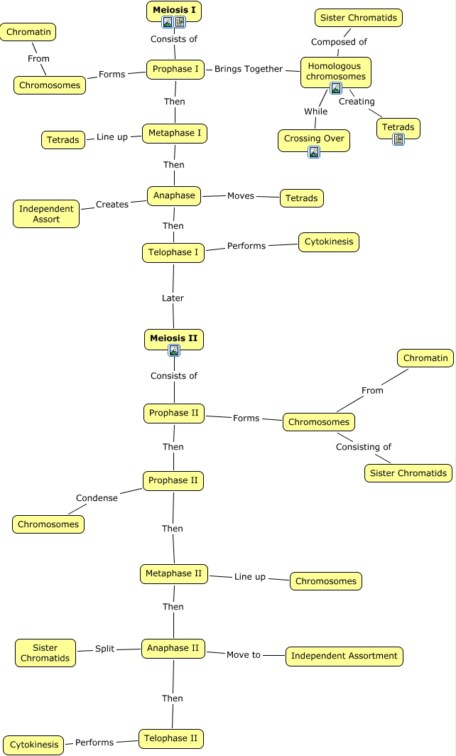 This Concept Map, created with IHMC CmapTools, has information related to: Meiosis, Telophase I Performs Cytokinesis, Homologous chromosomes Creating Tetrads, Meiosis I Consists of Prophase I, Anaphase Creates Independent Assort, Chromosomes From Chromatin, Prophase II Then Metaphase II, Prophase I Then Metaphase I, Homologous chromosomes Composed of Sister Chromatids, Prophase II Then Prophase II, Metaphase II Line up Chromosomes, Anaphase Moves Tetrads, Anaphase II Move to Independent Assortment, Meiosis II Consists of Prophase II, Metaphase I Then Anaphase, Prophase II Condense Chromosomes, Prophase I Forms Chromosomes, Anaphase Then Telophase I, Homologous chromosomes While Crossing Over, Metaphase I Line up Tetrads, Prophase II Forms Chromosomes