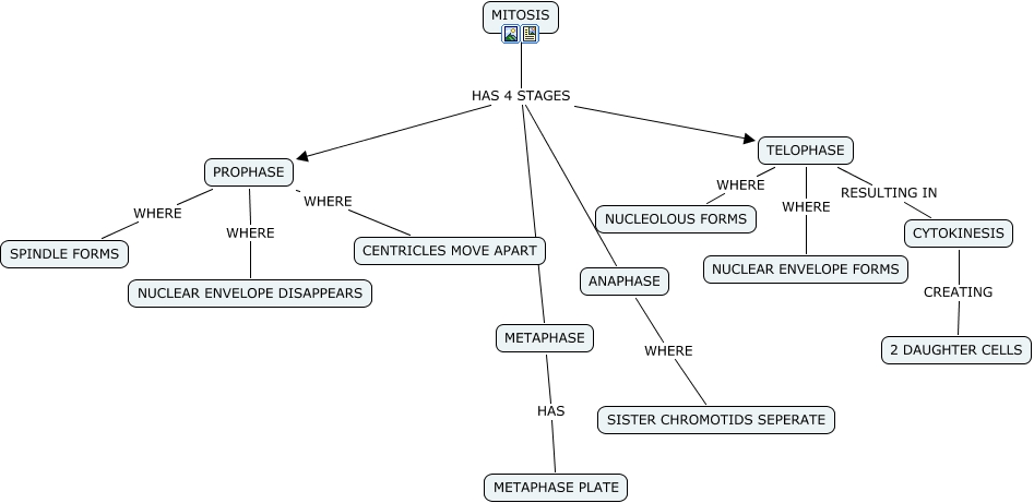 This Concept Map, created with IHMC CmapTools, has information related to: Mitosis, MITOSIS HAS 4 STAGES METAPHASE, ANAPHASE WHERE SISTER CHROMOTIDS SEPERATE, TELOPHASE WHERE NUCLEOLOUS FORMS, CYTOKINESIS CREATING 2 DAUGHTER CELLS, PROPHASE WHERE NUCLEAR ENVELOPE DISAPPEARS, TELOPHASE RESULTING IN CYTOKINESIS, PROPHASE WHERE CENTRICLES MOVE APART, TELOPHASE WHERE NUCLEAR ENVELOPE FORMS, PROPHASE WHERE SPINDLE FORMS, MITOSIS HAS 4 STAGES TELOPHASE, METAPHASE HAS METAPHASE PLATE, MITOSIS HAS 4 STAGES PROPHASE, MITOSIS HAS 4 STAGES ANAPHASE