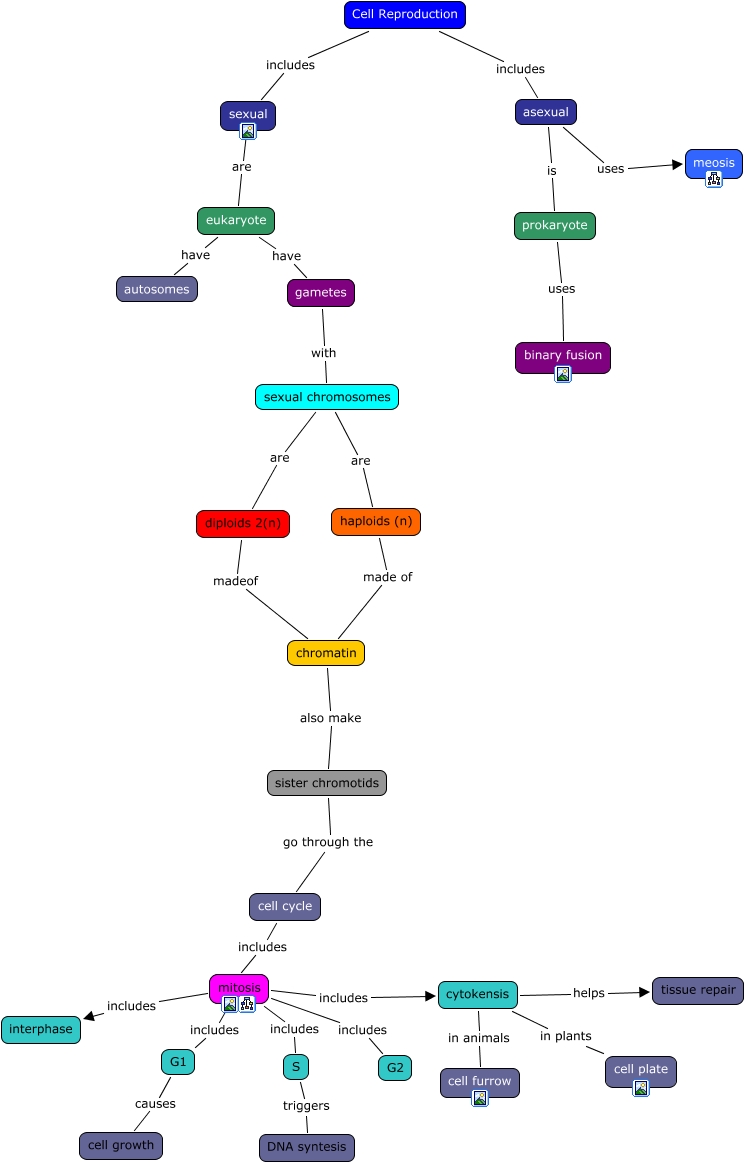 This Concept Map, created with IHMC CmapTools, has information related to: cell reproduction, eukaryote have gametes, cell cycle includes mitosis, sexual chromosomes are haploids (n), mitosis includes G1, gametes with sexual chromosomes, mitosis includes interphase, Cell Reproduction includes asexual, cytokensis in plants cell plate, prokaryote uses binary fusion, cytokensis helps tissue repair, Cell Reproduction includes sexual, asexual is prokaryote, G1 causes cell growth, eukaryote have autosomes, mitosis includes cytokensis, S triggers DNA syntesis, sexual are eukaryote, asexual uses meosis, mitosis includes G2, sexual chromosomes are diploids 2(n)